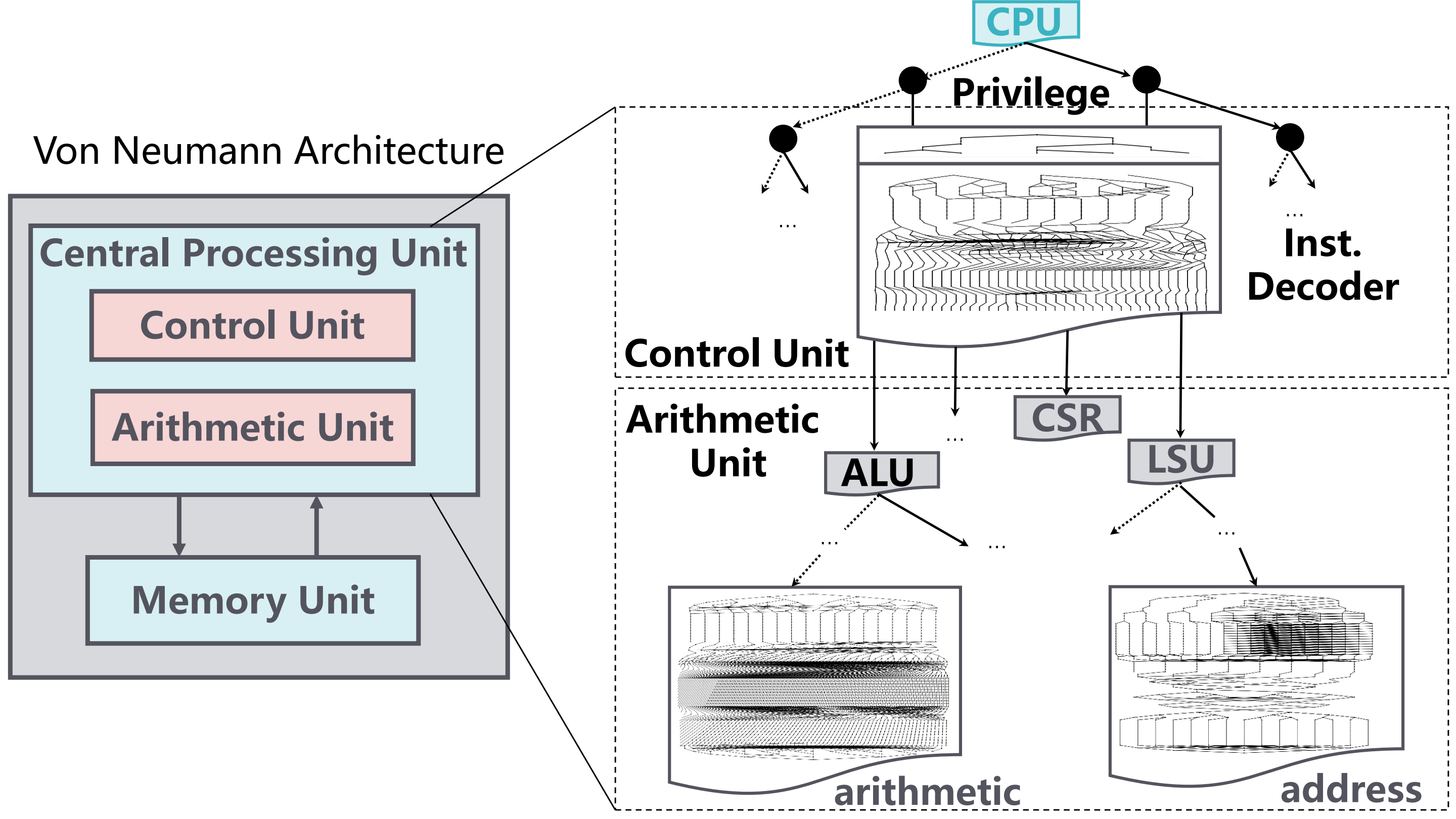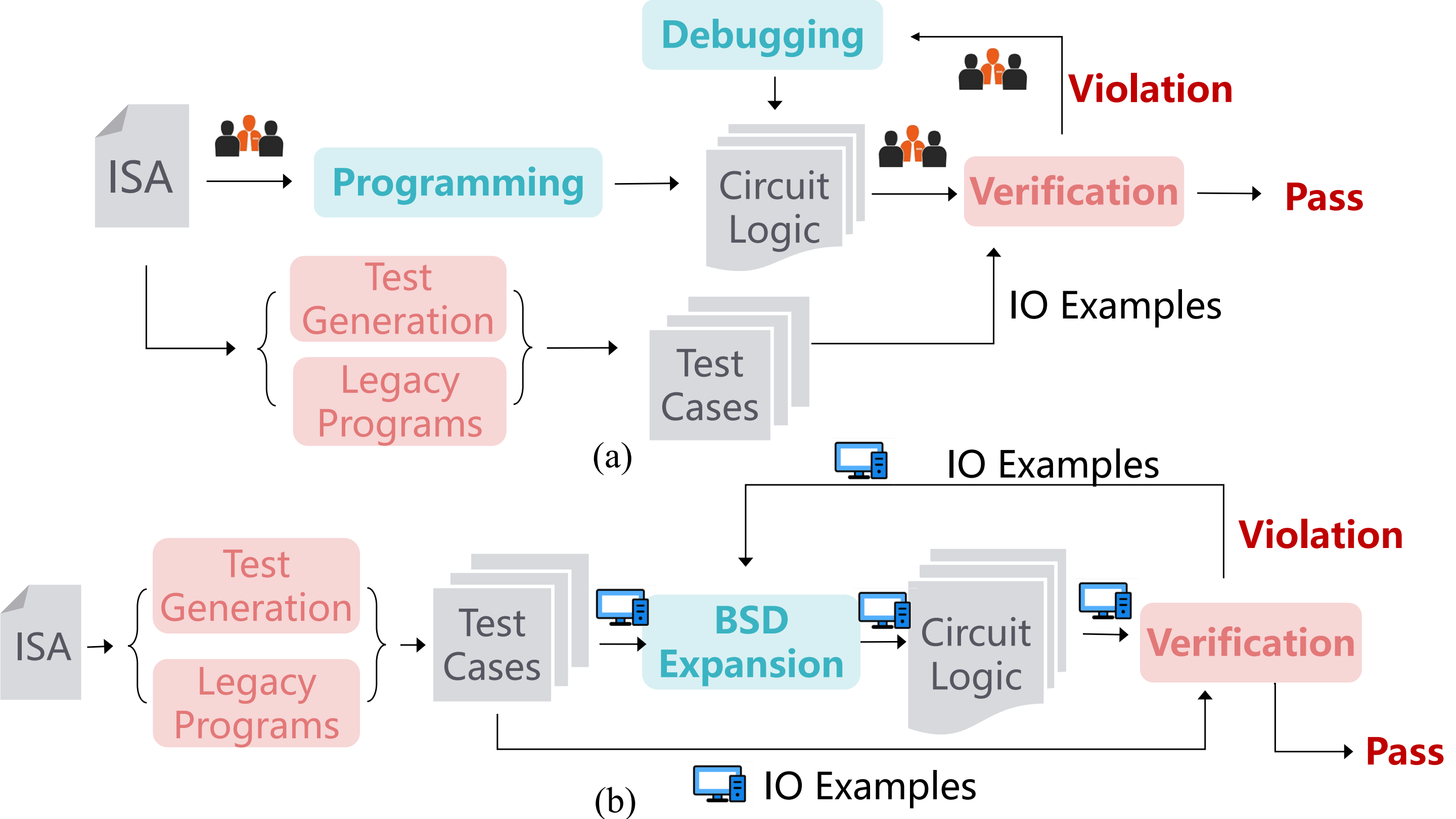 To automate CPU design without human programming, we are motivated to learn the CPU design from only input-output (IO) examples, which are generated from test cases of design specification (shown in Figure 1 (b)). The key challenge is that the learned CPU design must have near-zero tolerance for inaccuracy, rendering well-known approximate algorithms, such as neural networks, ineffective.