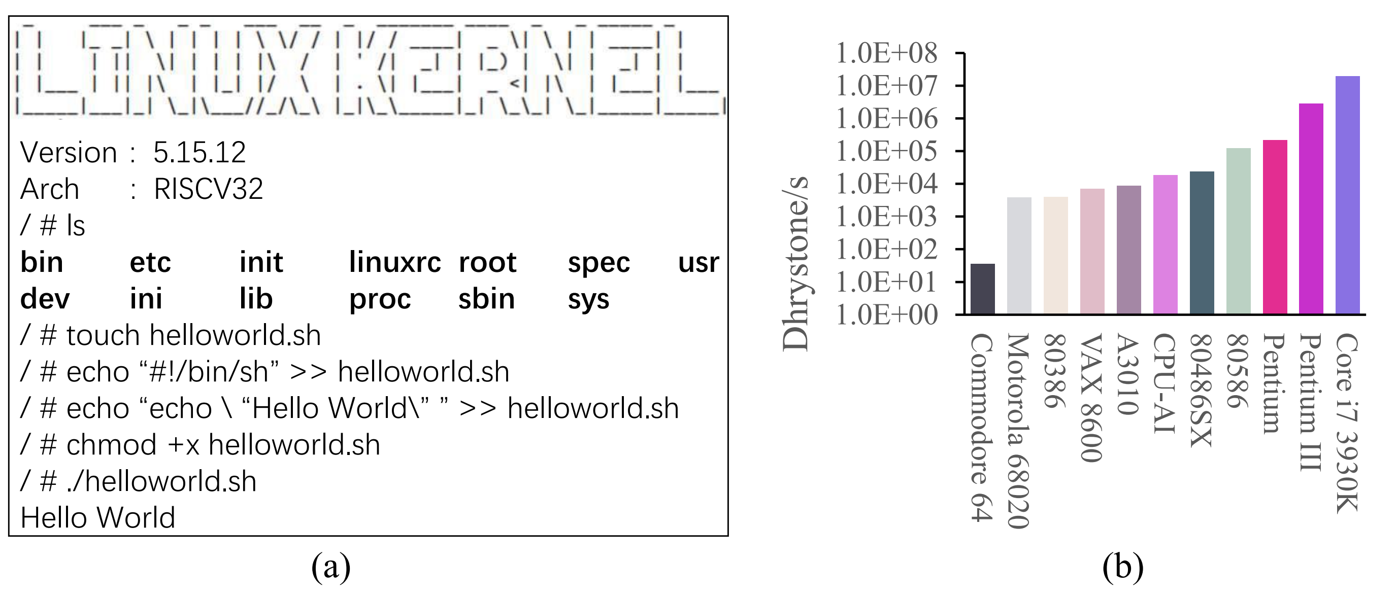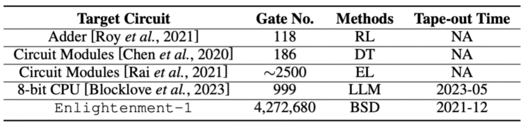 Our approach generates an industrial-scale RISC-V CPU design in just 5 hours which is over 1700× larger than existing work (shown in Table 1), reducing the design cycle by approximately 1000× without human involvement. The taped-out chip, Enlightenment-1, the world's first CPU designed by AI, successfully runs the Linux operating system and performs comparably to the human-designed Intel 80486SX CPU. Remarkably, our approach autonomously rediscovers human knowledge of the von Neumann architecture.
